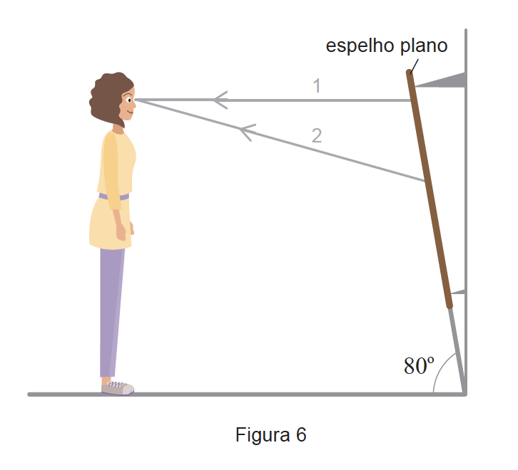No interior do elevador, uma pessoa observa-se ao espelho. Este encontra-se disposto numa posição inclinada, fazendo um ângulo de $80^\circ{}$ com a base do elevador, como se representa na Figura 6. Dois raios luminosos são refletidos no espelho e atingem os olhos da pessoa.