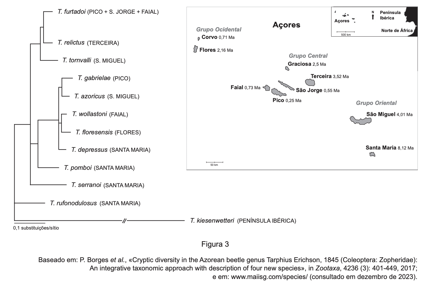 Com o objetivo de revelar as relações filogenéticas entre as várias espécies açorianas do género Tarphius, foram desenvolvidos estudos baseados numa abordagem integrada que combinou as características morfológicas com a análise molecular. Foi utilizado um fragmento de DNA mitocondrial (mtDNA), que inclui o gene que contém a informação para a síntese do RNA de transferência do aminoácido leucina (tRNA-Leu). A taxa de substituição de nucleótidos no fragmento analisado foi utilizada para inferir os tempos de divergência. A Figura 3 representa o arquipélago dos Açores e a árvore filogenética dos escaravelhos Tarphius, baseada na análise do mtDNA. Nesta árvore filogenética indica-se a distribuição geográfica das diferentes espécies nas ilhas.