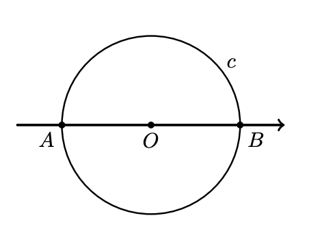 Na figura estão representados a reta numérica de origem $O$, os pontos $A$ e $B$ pertencentes a essa reta, e a circunferência $c$, de centro no ponto $O$ e diâmetro $[A B]$.