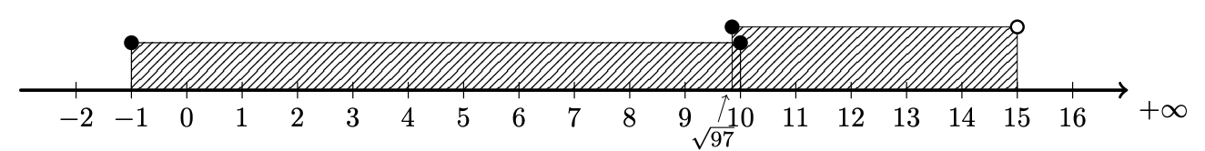Em baixo segue a representação dos conjuntos $A$ e $B$ na reta real, tendo em conta que $\sqrt{97}<10$. Assim temos que $[-1,10] \cup[\sqrt{97}, 15[=[-1,15[$