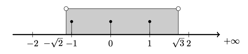 Como $-\sqrt{2} \approx-1,1414$ e $\sqrt{3} \approx 1,7321$, representando na reta real o intervalo $]-\sqrt{2}, \sqrt{3}[$, e os números inteiros que pertencem a este conjunto, podemos verificar que o conjunto dos números inteiros que pertencem ao intervalo $]-\sqrt{2}, \sqrt{3}[$ é