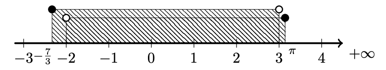 Como $\pi \approx 3,14$, representando o conjunto os dois intervalos na reta real, temos que $]-2, \pi] \cup\left[-\frac{7}{3}, 3\left[=\left[-\frac{7}{3}, \pi\right]\right.\right.$