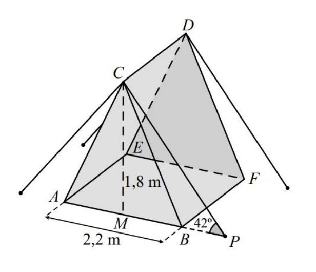 No modelo, o prisma triangular reto $[A B C D E F]$ representa a tenda, o triângulo $[A B C]$ representa a entrada da tenda, o segmento de reta $[C P]$ representa um dos cabos de suporte, e o ponto $P$ representa o local da superfície onde a estaca fixa esse cabo.