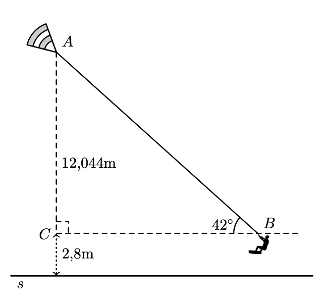 Desta forma, temos que a distância da asa à superfície da água, ou seja, a distância do ponto $A$ à reta $s$, em metros, arredondado às décimas, é a soma de $\overline{A C}$ com a distância do ponto $B$ à reta $s$, ou seja: