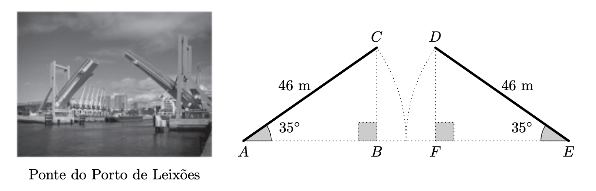 No esquema da figura seguinte, está representada a posição, em relação à horizontal, que as duas secções móveis da ponte tinham num certo instante. Nesse esquema, as seç̧ões móveis estão representadas pelos segmentos de reta $[A C]$ e $[E D]$.