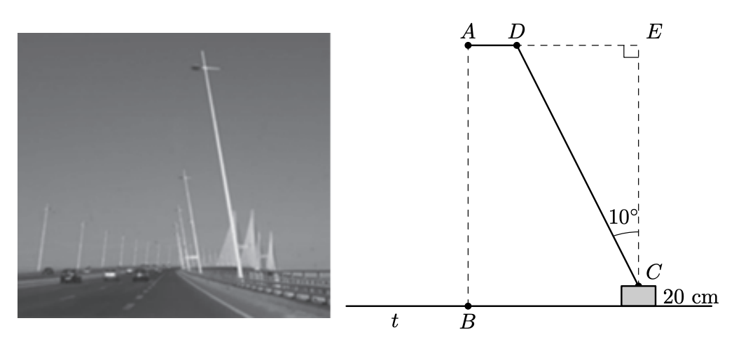 Assim, como a distância $(d)$ da reta $t$ ao ponto $C$ é 20 centímetros, ou seja, 0,2 metros e como $\overline{A B}=$ $\overline{C E}+d$, vem que a distância do candeeiro ao tabuleiro da ponte, em metros, arredondado às décimas, é:
