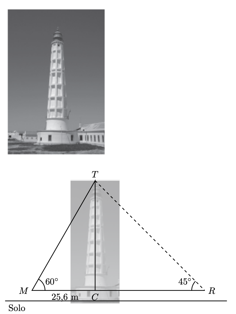 Nesse esquema, o ponto $T$ corresponde ao topo do farol, o ponto $M$ corresponde ao ponto de observação da Marta, e o ponto $R$ corresponde ao ponto de observação do Rui.