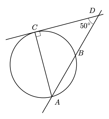 Na figura seguinte, estão representadas as retas $A D$ e $C D$ e a circunferência de diâmetro $[A C]$