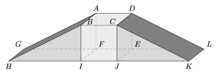Este modelo é um sólido que pode ser decomposto no cubo $[A B C D E F I J]$ e nos prismas triangulares retos $[B H I F A G]$ e $[C K J E D L]$, geometricamente iguais. As bases dos prismas são triângulos retângulos. Sabe-se ainda que: