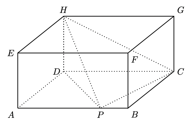 Na figura ao lado, estão representados um paralelepípedo $[A B C D E F G H]$ e uma pirâmide $[H D P C]$, sendo $P$ um ponto de $[A B]$