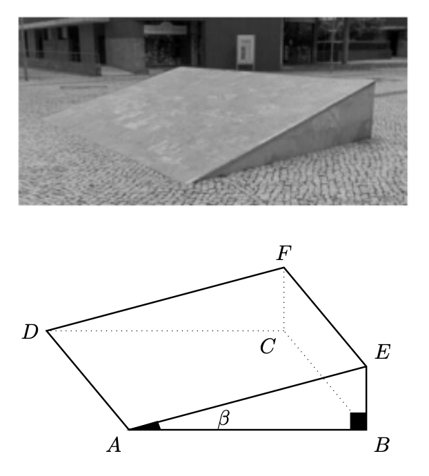 Na figura em cima, podes observar uma rampa de pedra, cujo modelo geométrico é um prisma em que as faces laterais são retângulos e as bases são triângulos retângulos; esse prisma encontra-se representado na figura de baixo.