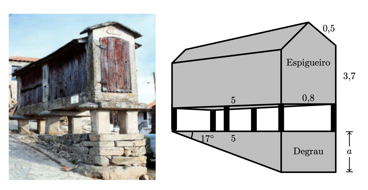 A figura da direita é um esquema do espigueiro da fotografia. Neste esquema, estão também representados os seis pés do espigueiro, bem como o degrau no qual eles assentam. O esquema não está desenhado à escala. As medidas de comprimento indicadas estão expressas em metros. A questão seguinte refere-se a este esquema.