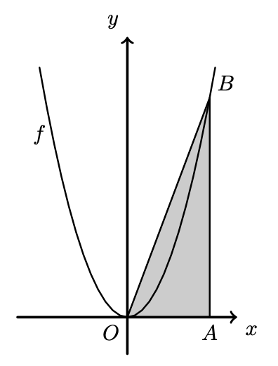 Na figura, estão representados, em referencial cartesiano, de origem no ponto $O$, parte do gráfico de uma função quadrática, $f$, e o triângulo $[A O B]$.