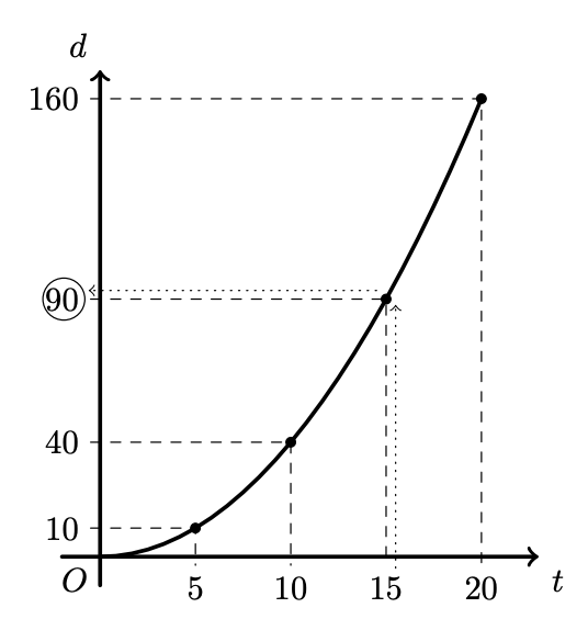 Na figura, está representado, em referencial cartesiano, o gráfico da função que traduz a correspondência entre o tempo, $t$, em segundos, e a distância, $d$, em metros, do drone à plataforma nos primeiros 20 segundos de voo.
