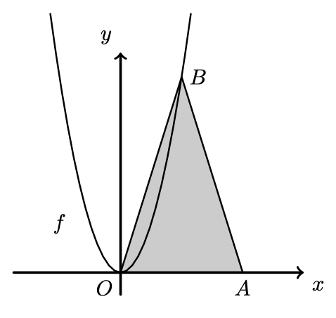 Na figura seguinte, estão representados, em referencial cartesiano, uma função quadrática $f$ e o triângulo isósceles $[O A B]$