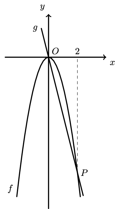 - o ponto $P$ pertence ao gráfico da função $f$ e ao gráfico da função $g$ e tem abcissa igual a 2