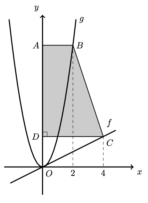 - o ponto $B$ pertence ao gráfico da função $g$ e tem abcissa 2