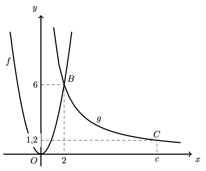 - o ponto $C$ pertence ao gráfico da função $g$ e tem coordenadas $(c ; 1,2)$, sendo $c$ um número positivo