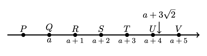 Como $3 \sqrt{2} \approx 4,24$, ou seja, $4<3 \sqrt{2}<5$ e a distância entre cada dois pontos consecutivos é 1 , então o ponto de abcissa $a+3 \sqrt{2}$ está situado entre os pontos $U$ e $V$ porque