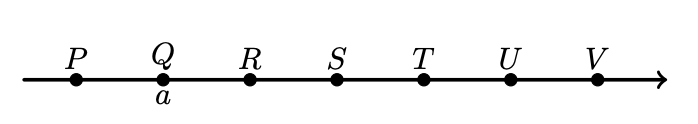 Na figura seguinte, está representada a reta real. Nesta reta, estão assinalados os pontos $P, Q, R, S, T$, $U$ e $V$.