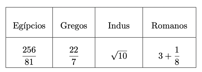 Através dos tempos, foram utilizadas diferentes aproximações para o valor de $\pi$ (pi). Na tabela estão indicados alguns desses valores.