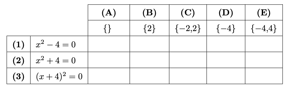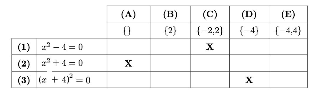 Para cada equação, (1), (2) e (3), assinala com $\mathbf{X}$ a opção que apresenta o respetivo conjunto solução.