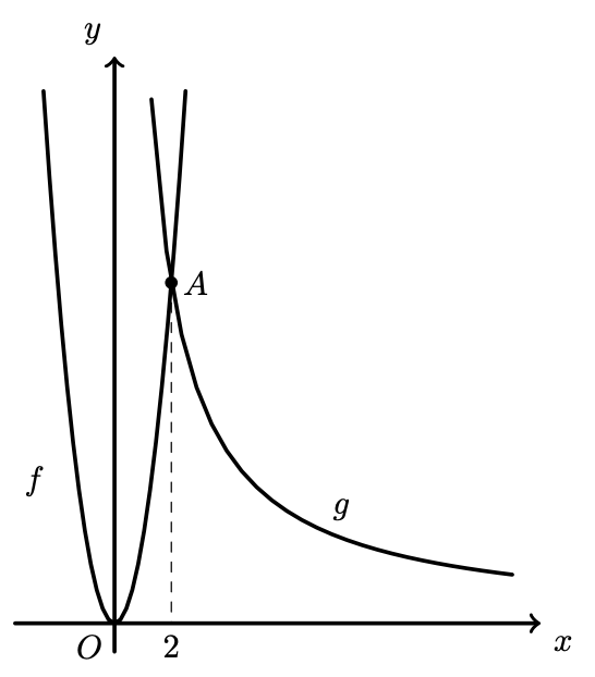 - os gráficos das funções $f$ e $g$ intersectam-se no ponto $A$, de abcissa 2 .