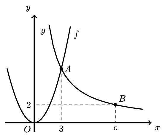 Desta forma, como a função $g$ é definida por $g(x)=\frac{18}{x}$, substituindo a ordenada do ponto $B$ na expressão de $g$, podemos calcular o valor da abcissa, ou seja, o valor de $c$ :
