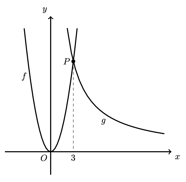 - os gráficos das funções $f$ e $g$ intersectam-se no ponto $P$, de abcissa 3 .