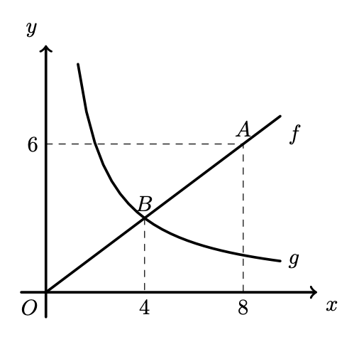 - o ponto $B$ pertence ao gráfico de $f$ e ao gráfico de $g$ e tem abcissa igual a 4