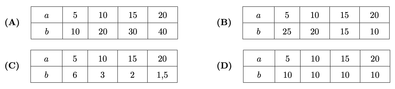 Em cada uma das opções seguintes está uma tabela que relaciona os valores de duas grandezas, $a$ e $b$.