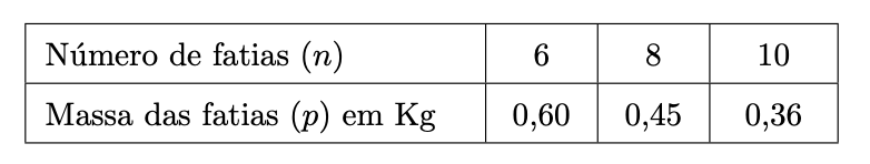 A massa ( $p$ ) de cada uma das fatias de bolo é inversamente proporcional ao número de fatias $(n)$