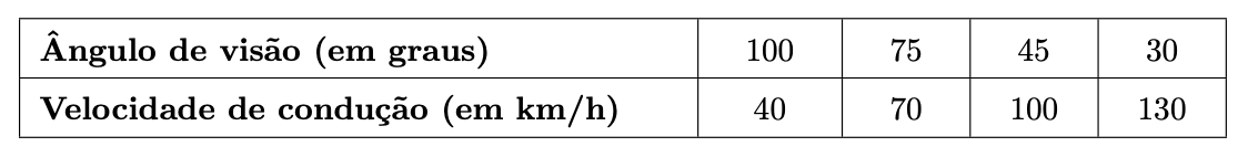 A tabela seguinte relaciona o ângulo de visão com a velocidade de condução.
