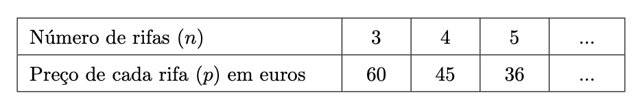 A tabela seguinte representa a relação entre o número de rifas $(n)$ que devem vender e o preço $(p)$, em euros, de cada rifa.