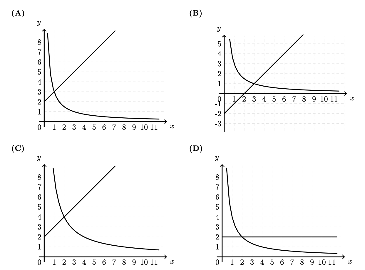 $$\begin{gathered}y=x+2 \quad \text { para } x \geq 0 \y=\frac{3}{x} \quad \text { eara } x>0\end{gathered}$$