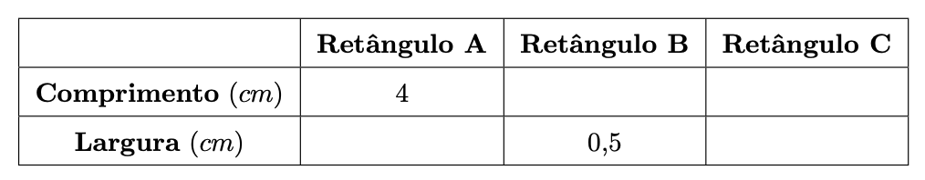 Completa a tabela que se segue, indicando, em $\mathrm{cm}$, o comprimento e a largura de três retângulos diferentes (A, B e C), com $18 \mathrm{~cm}^{2}$ de área.