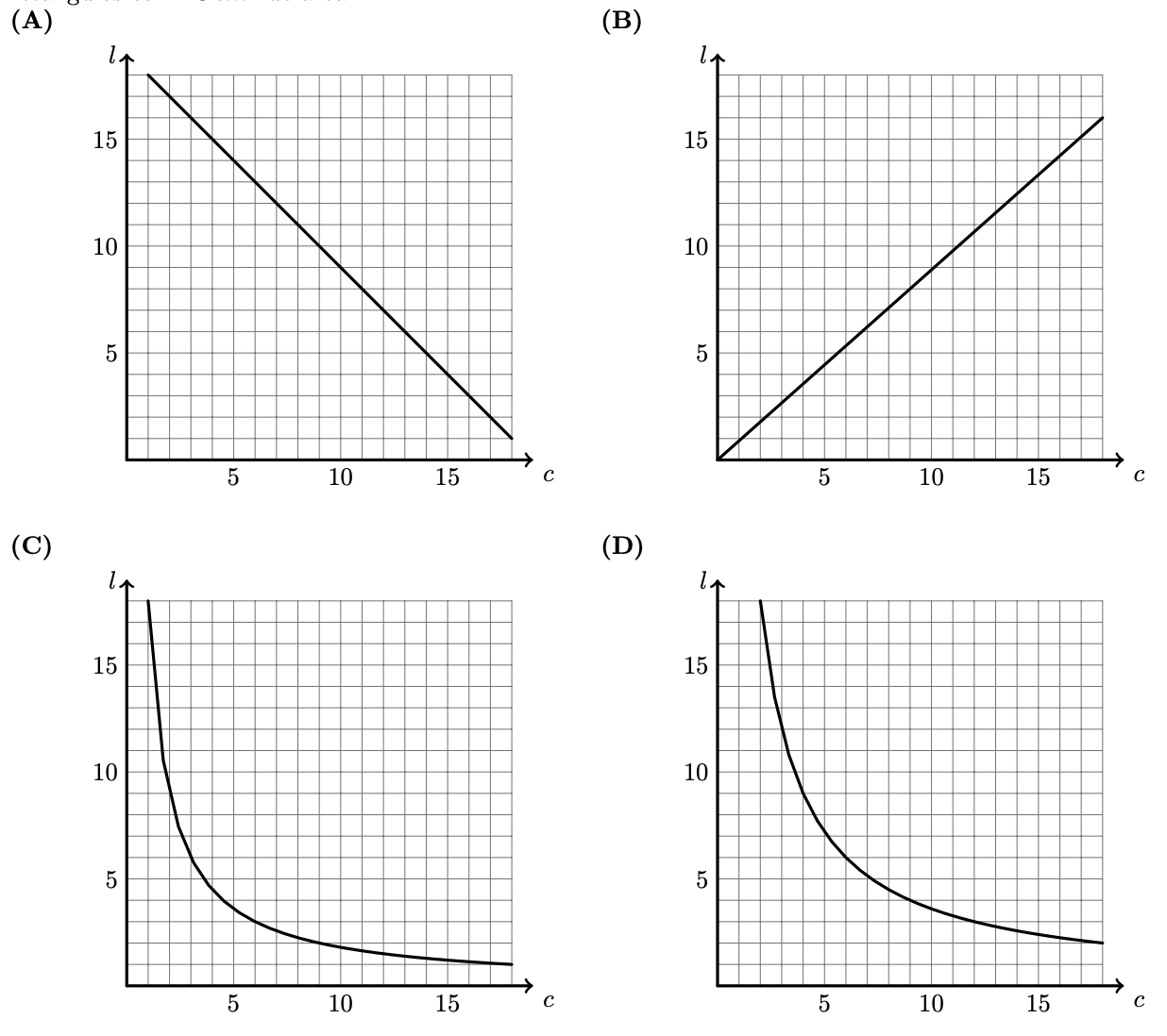 Qual dos gráficos seguintes pode representar a relação entre a largura $(l)$ e o comprimento $(c)$ de retângulos com $18 \mathrm{~cm}^{2}$ de área?