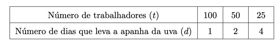 Qual das seguintes fórmulas relaciona o número de trabalhadores $(t)$, com o número de dias $(d)$ necessário para apanhar a uva, na quinta Alzubar?