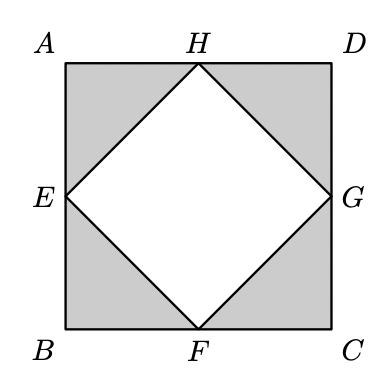 Na Figura, estão representados os quadrados $[A B C D]$ e $[E F G H]$, sendo os vértices $E, F, G$ e $H$ os pontos médios dos lados do quadrado $[A B C D]$.