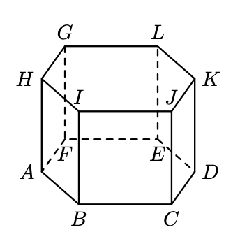 Considera o prisma hexagonal regular $A B C D E F G H I J K L$ representado na figura seguinte.