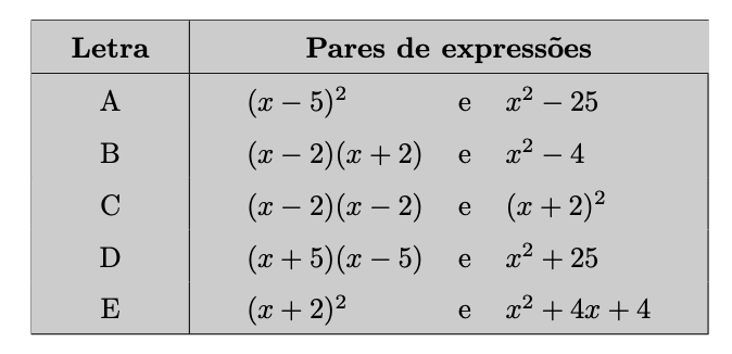 A tabela abaixo apresenta cinco pares de expressões, identificados pelas letras de A a E. Desses cinco pares, apenas dois são pares de expressões equivalentes.