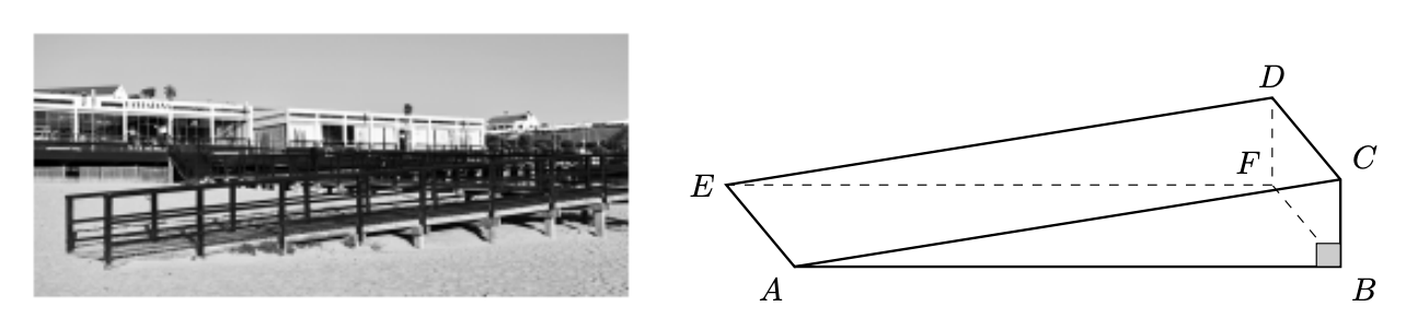 Na figura da direita, está representado o prisma triangular reto $[A B C D E F]$, que é um esquema dessa rampa.
