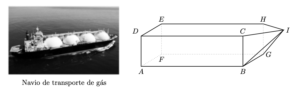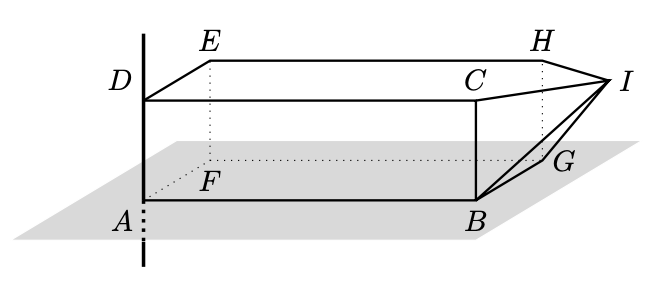 Este esquema é composto pelo paralelepípedo retângulo $[A B C D E F G H]$ e pela pirâmide retangular irregular $[B C H G I]$, cujo vértice $I$ pertence ao plano que contém a face $[C D E H]$ do paralelepípedo retângulo.
