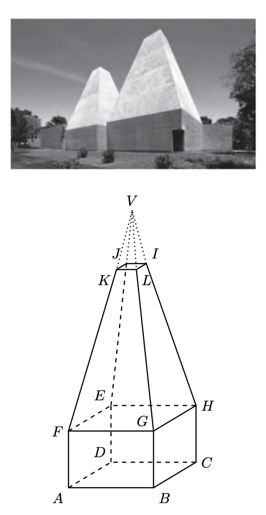 No esquema, estão representados o prisma reto de bases quadradas $[A B C D E F G H]$ e o tronco de pirâmide $[E F G H I J K L]$, da pirâmide reta de base quadrada $[E F G H V]$. As faces $[E F G H]$ e $[I J K L]$, do tronco de pirâmide, são paralelas.