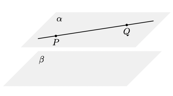 Como os pontos $P$ e $Q$ pertencem ao plano $\alpha$, então a reta $P Q$ está contida no plano $\alpha$, e por isso, é paralela ao plano $\beta$