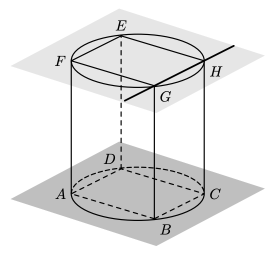 Na figura, estão representados um cilindro e um prisma quadrangular regular $[A B C D E F G H]$ de bases $[A B C D]$ e $[E F G H]$, inscritas nas bases do cilindro.