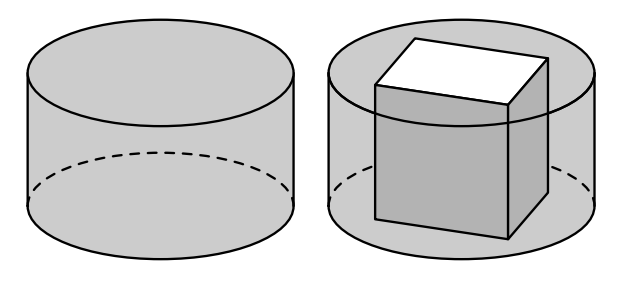 Na figura seguinte, à esquerda, está representado um recipiente cilíndrico que se encheu com um líquido colorido. Nesse líquido, mergulhou-se um cubo cuja aresta é igual à altura do cilindro. Tal como figura da direita, sugere, o cubo ficou assente na base do recipiente.