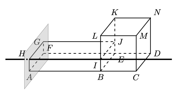 O modelo representado na figura da direita é um sólido que pode ser decomposto no cubo $[B C D E K L M N]$ e no paralelepípedo retângulo $[A B E F G H I J]$. O modelo não está desenhado à escala.
