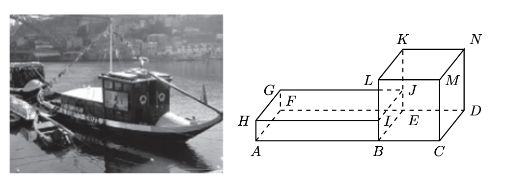 A figura da direita representa um modelo geométrico, em tamanho reduzido, da parte coberta desse barco.