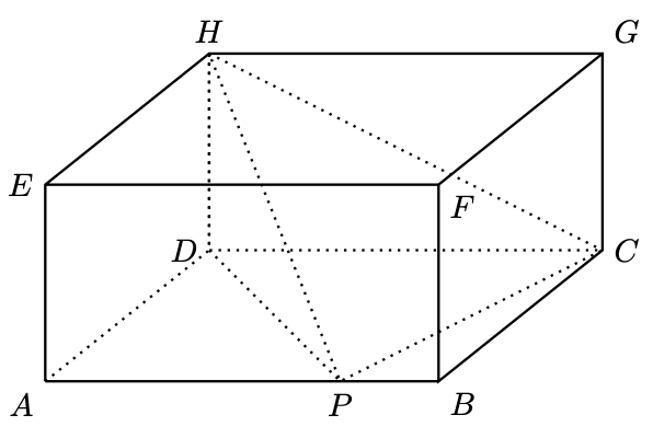 Na figura, estão representados um paralelepípedo $[A B C D E F G H]$ e uma pirâmide $[H D P C]$, sendo $P$ um ponto de $[A B]$